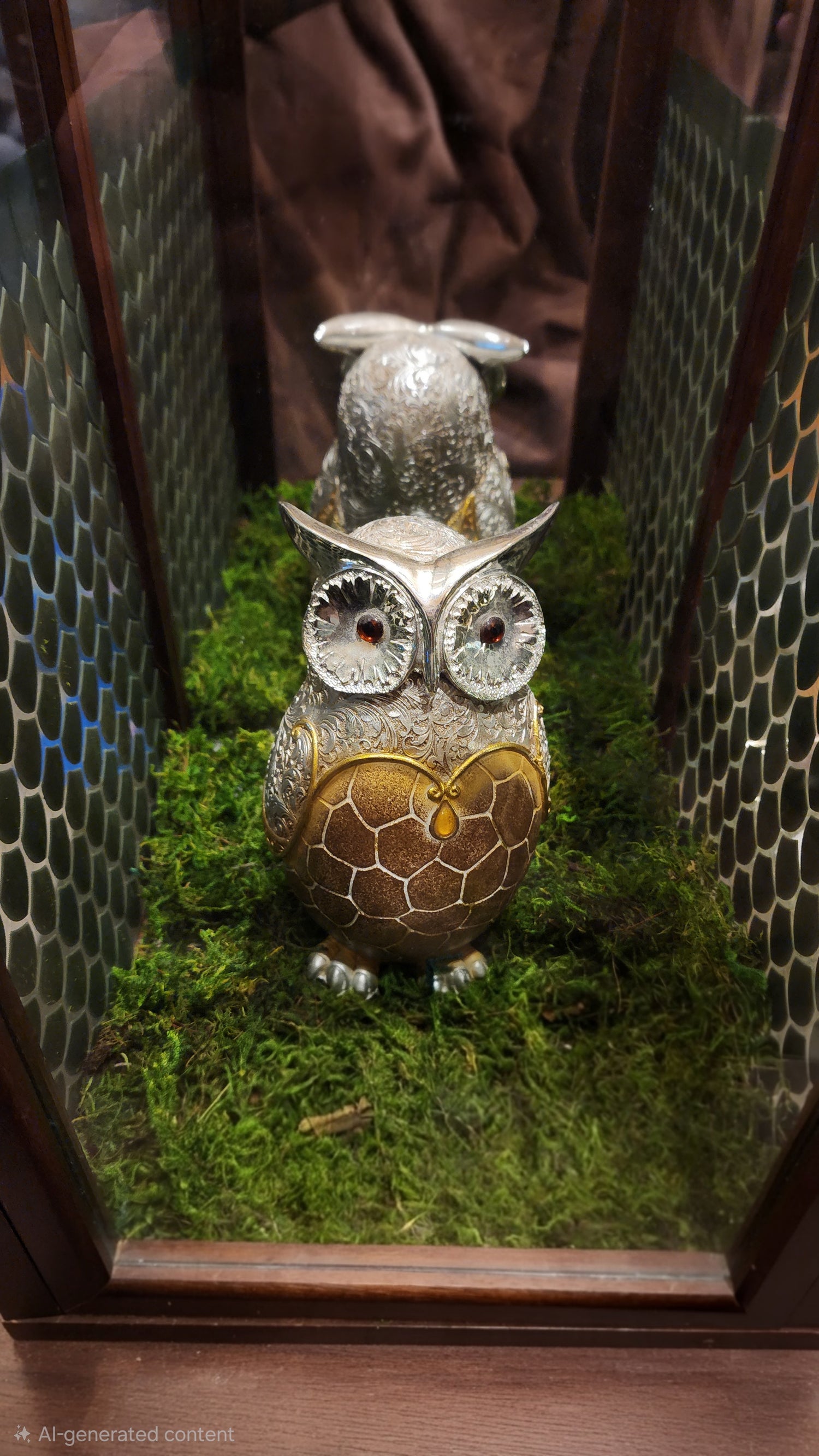 This owl was just a boring knickknack sitting on a shelf, the glass box with mirror was added to make it more decretive, but it needed something. Green Scales were added to the side walls to help give it some different light and depth to the box.